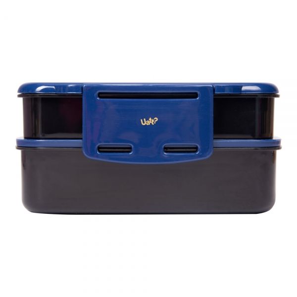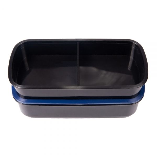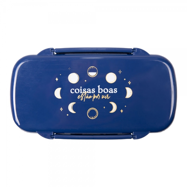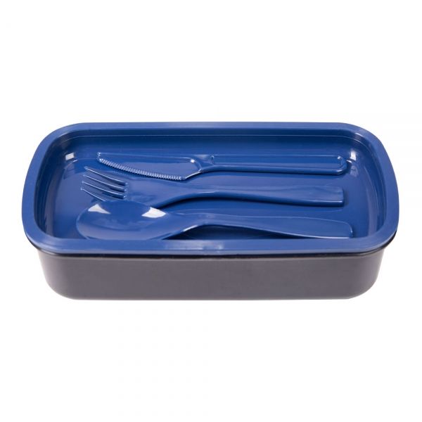 Contém: 1 Tampa com travas laterais, 1 colher, 1 faca e 1 garfo, 1 divisória removível, 2 potes.